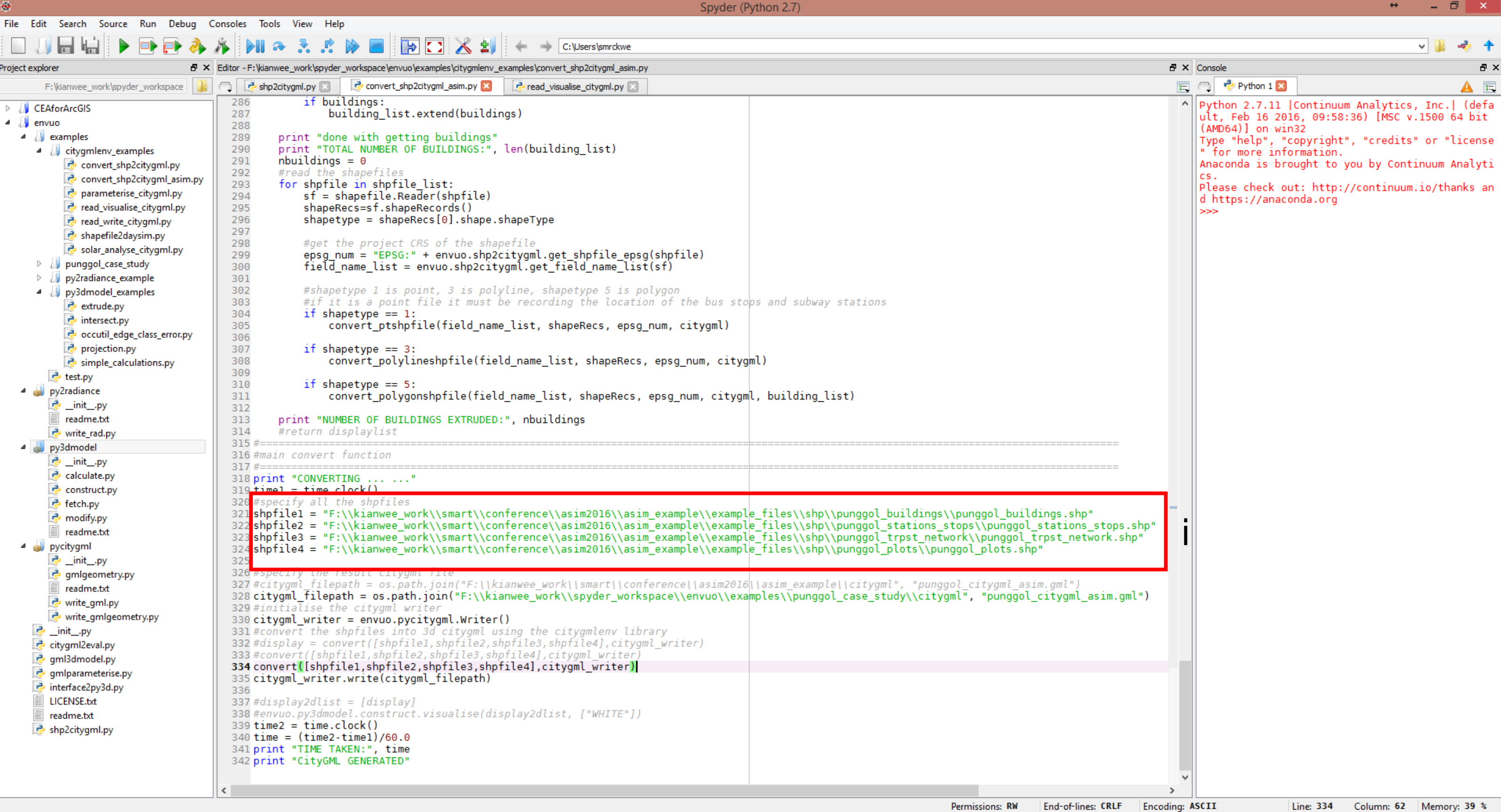 - i.) In the previous section QGIS generates 4 shapefiles. Specify the shapefiles in the envuo\examples\convert_shp2citygml_asim.py script. Specify the result citygml file. Run the script.