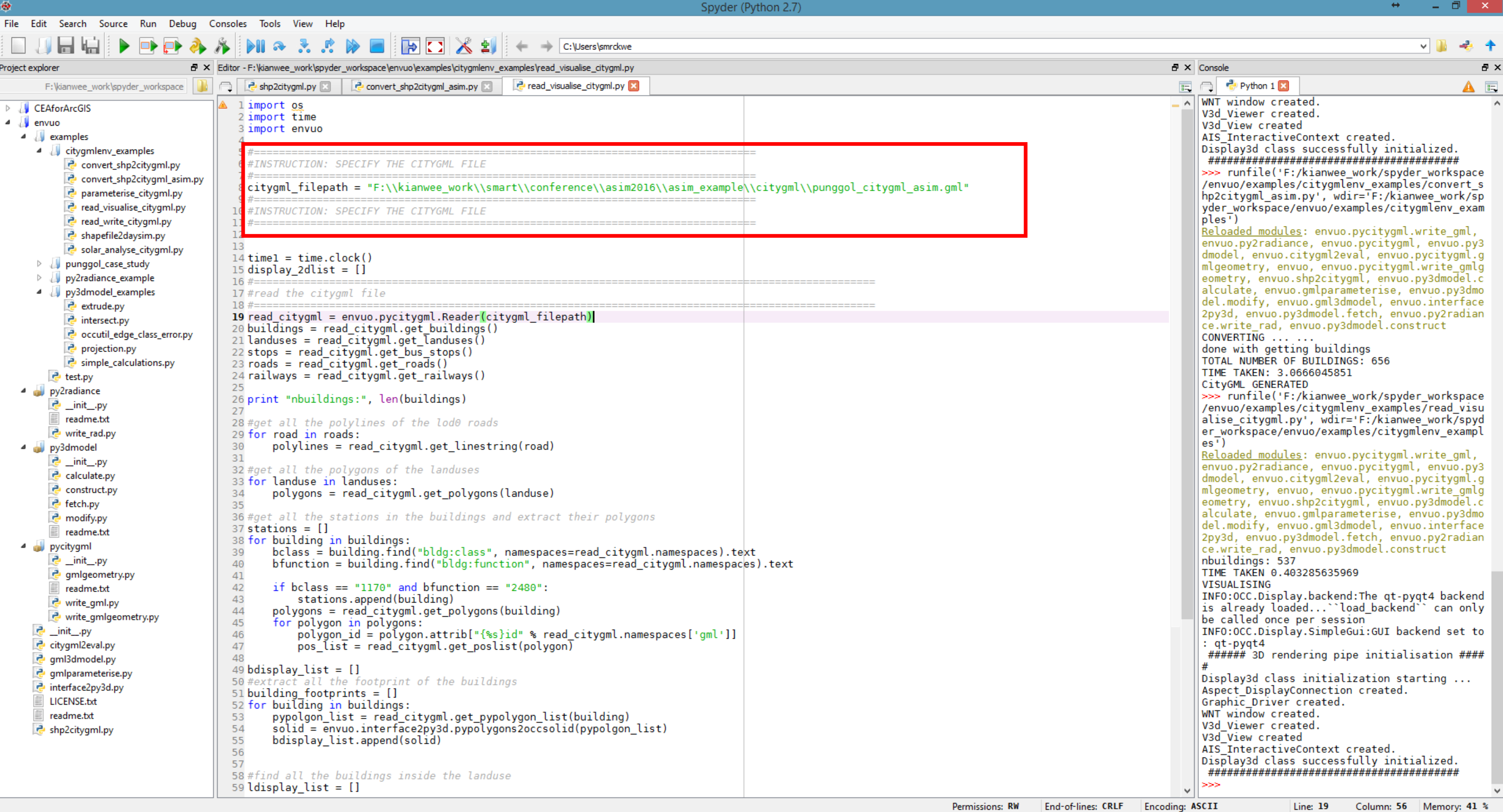 - 3.) Specify the citygml file in the "envuo\examples\read_visualise_citygml.py" script. Run the script.