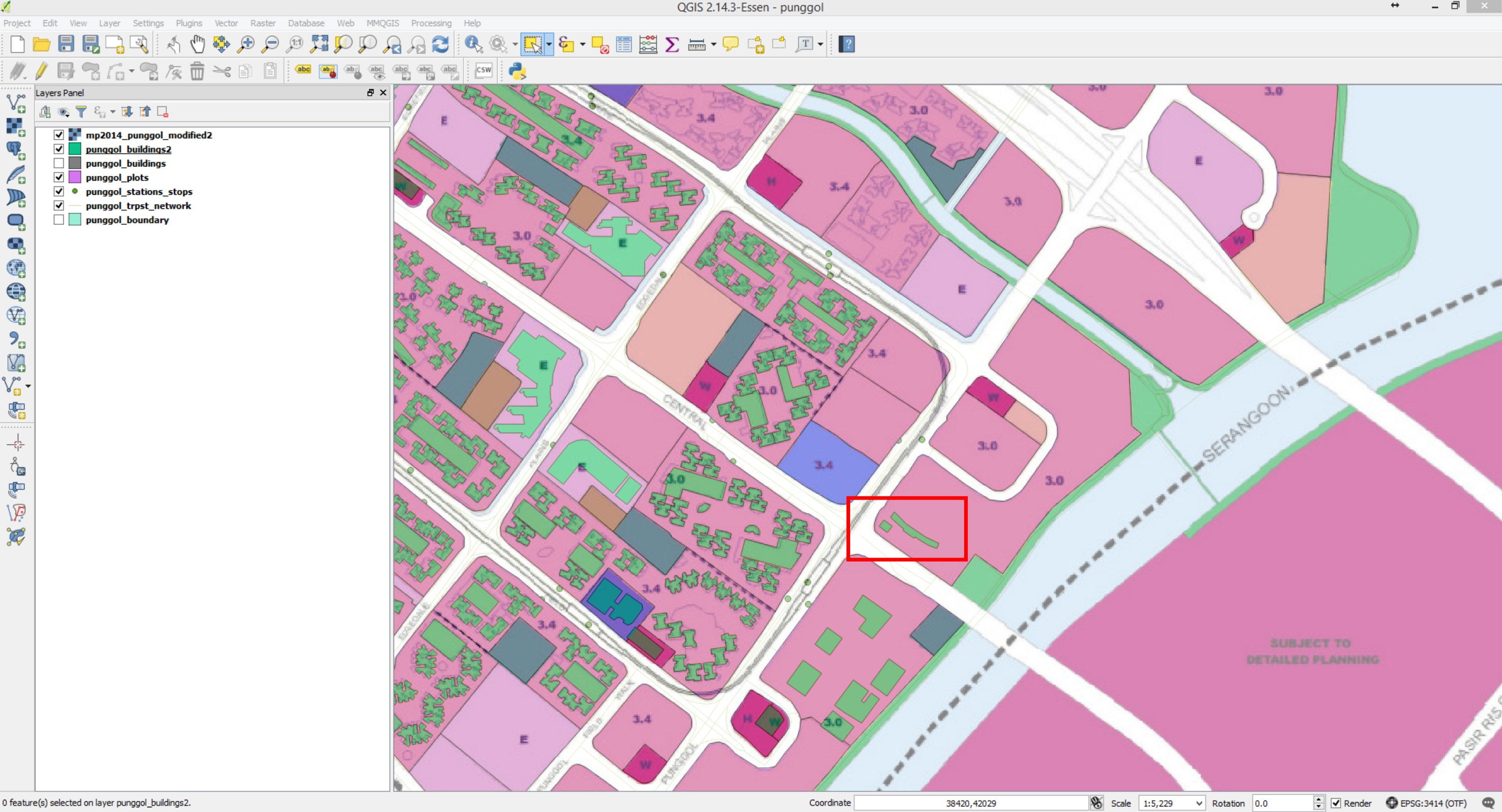 - 5.) From google map, the buildings are commercial. The plot is labelled as residential. Correct the plot to commercial. Since there are no other buildings on the plot, the extrusion will not work. Remove the plot ratio attribute and set it to NULL. Adjust and correct any other plots with error