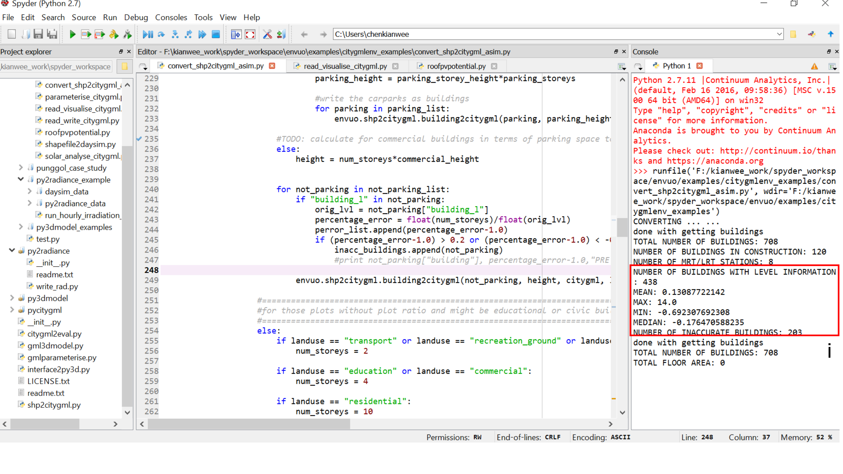 - i.) The script informs the mean, maximum, minimum, and median of their height error. It also informs the number of buildings with height information. The script counts the number of inaccurate buildings. A building is inaccurate when the predicted height differs from the original height by 20%. A Citygml file based on the actual building height is also generated if the information is available.