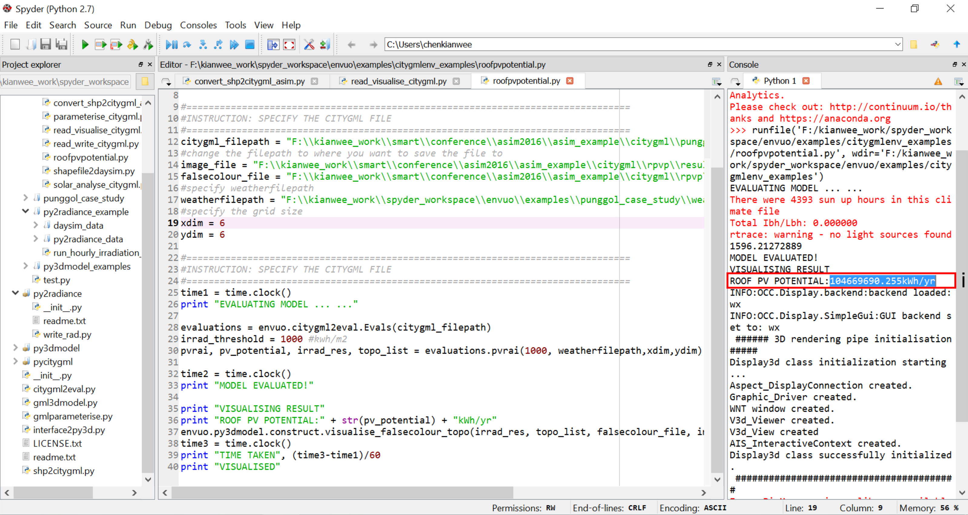 - 6.) Specify the citygml file in the "envuo\examples\roofpvpotential.py" script. Run the script.