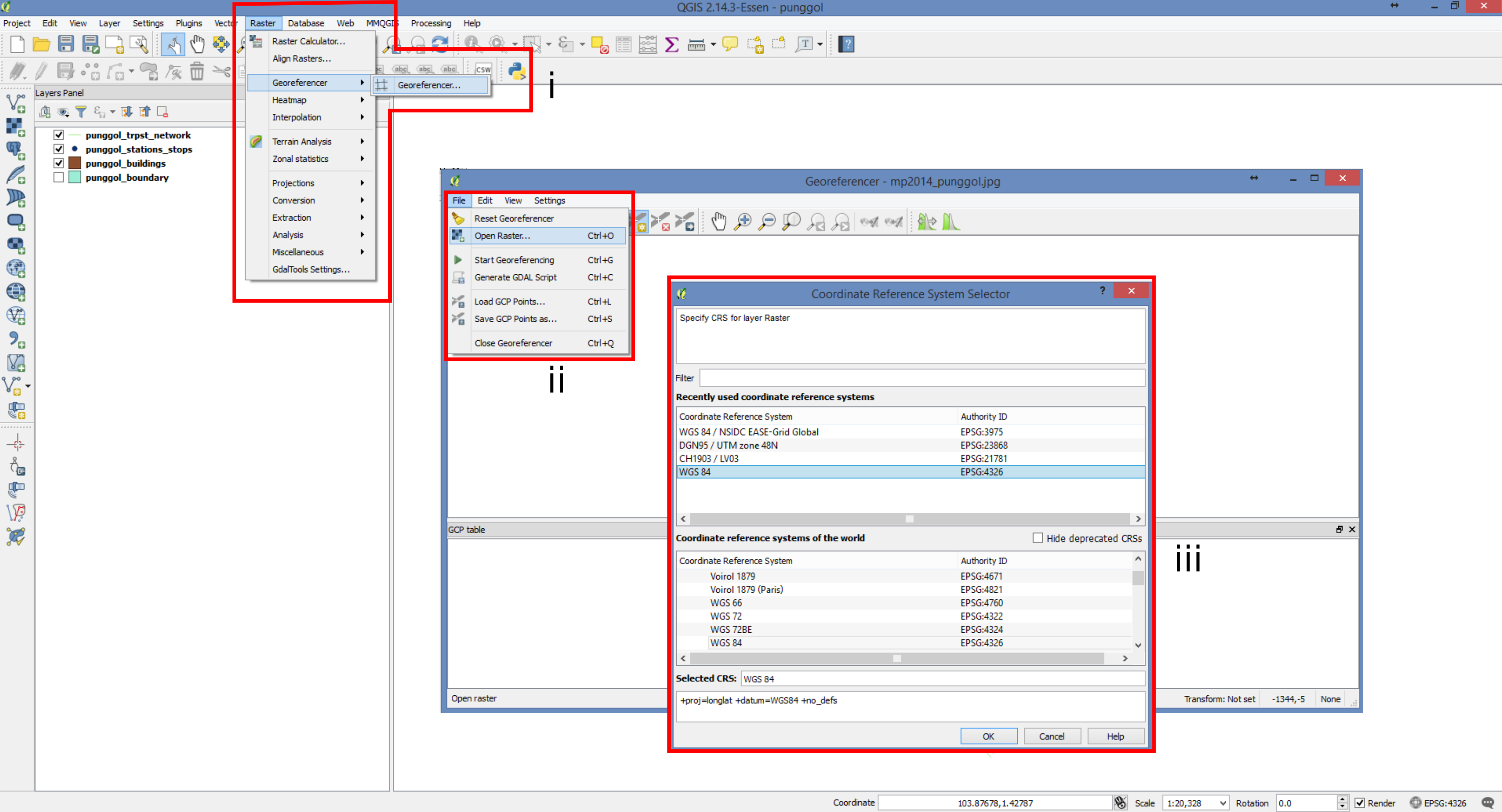- i.) Go to Raster -> Georefrencer -> Georefrencer ...
