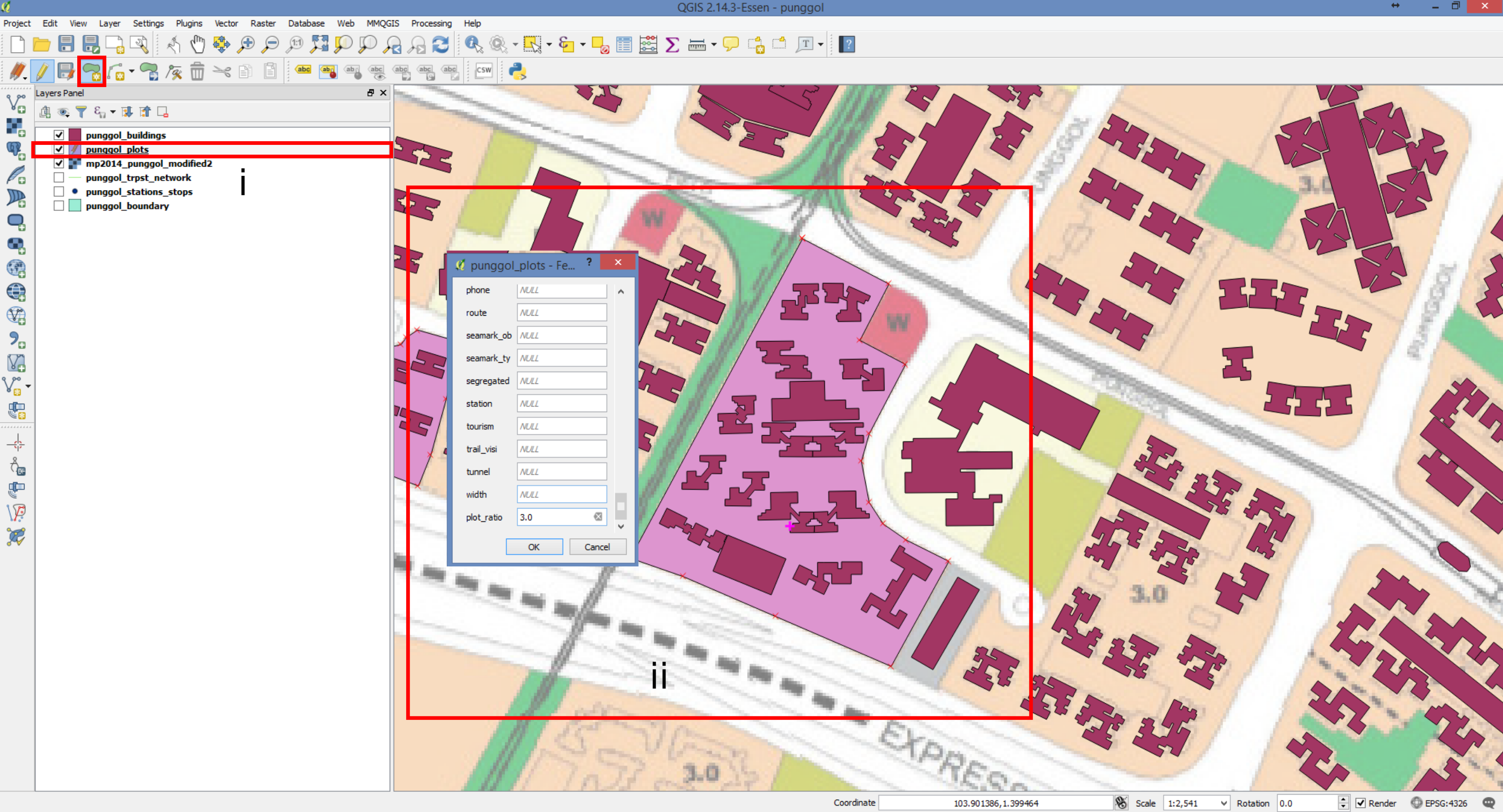 - i.) Select the punggol_plots layer. Click on the "Add Feature" icon.